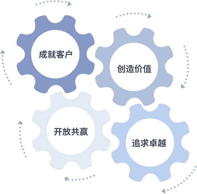 成就客户是一切决策的出发点,,,创造价值是衡量所有工作的标准,,追求卓越是我们做事做人的态度,,,,开放共赢是我们的格局也是最终的结果。。。。价值观的齿轮环环相扣,,推动着组织里的每个人不断向前。。。。